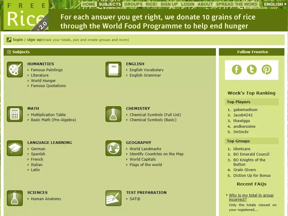 FreeRice 提供法语、意大利语、韩语等多语种版本,英文版首页上默认的游戏方式是英语词汇的近义词选择,但也可以在页面上方的SUBJECTS选择不同科目的题目: