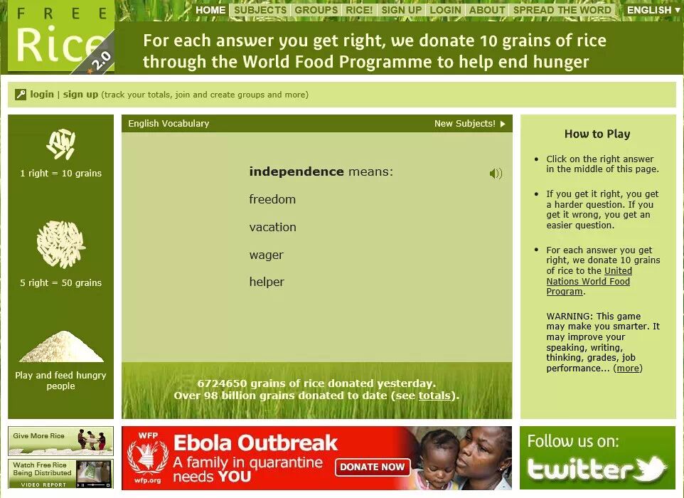 FreeRice是联合国世界粮食计划署(WFP)旗下的一款公益性质的网页游戏,由美国网络筹款活动先驱约翰·布林创办。自2007开始运营,捐出的米粒从第一天的几百粒到现在一天达到了近一亿粒。