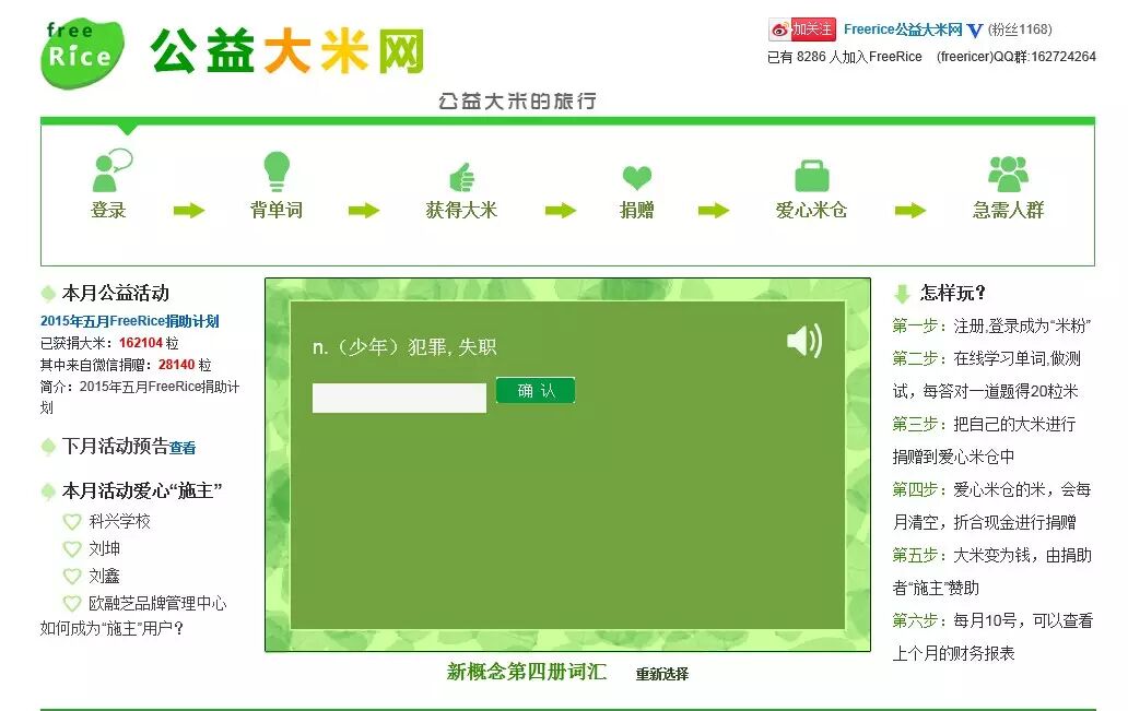 推荐一个网站给大家http://freerice.com,尤其是在学英语又有公益之心的朋友,正如网站消息栏中写着“无论你是大公司的CEO还是穷国家的街头流浪的孩子,提高英语词汇量都会改善你的生活”。在这个网站你可以通过回答英文题目帮助饥饿的儿童,FreeRice 的题目是英语单词的近义词选择题,每题四个选项,难度随着答对次数的增多逐渐增加。开始答题后,页面右面会出现一个装大米的盘子,每答对一题,盘子上就会放10粒大米,而网站赞助商便会向联合国世界粮食计划署提供这10粒大米。FreeRice购买大米的资金主要来自赞助商(广告收入)。