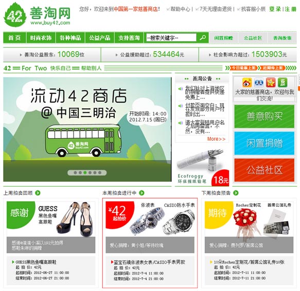 国内第一家在线慈善商店——善淘网(www.buy42.com , buy42的含义是指 buy for two),通过在线义卖企业及个人捐赠的闲置物品,扣除日常必须的成本开支,所有收入均用来帮助残障伙伴获得就业,培训和融入社会的机会。善淘线下营运中心的工作伙伴也都以残障人士为主。