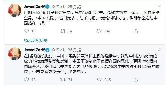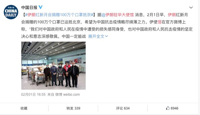 物资虽然不多,但是这已经基本清空了巴基斯坦库政府的所有库存。而此时巴基斯坦国内,还正面临着27年来最严重的的蝗灾,本该需要防护服的巴铁,却第一时间把物资送到了我们手里。巴基斯坦政府表示,愿意调动巴基斯坦境内所有库存物资,为中国提供防疫医疗物资援助。也正是在2月1日下午,伊朗伊斯兰共和国驻华大使馆官微发布,伊朗红新月会捐赠的100万只口罩已于2月1日抵达北京。即使面对美国的制裁和围堵,伊朗还冲破枷锁,空运100万个口罩援华。伊朗外长发文写道:无论何时何地,伊朗都坚定与中国站在一起。即使自己身处逆境,却还愿意向中国伸出援手,伊朗人民的情谊,我们会永远铭记!而除了政府官方捐赠以外, 不少民间团体、爱心人士也纷纷加入援华队伍中来。