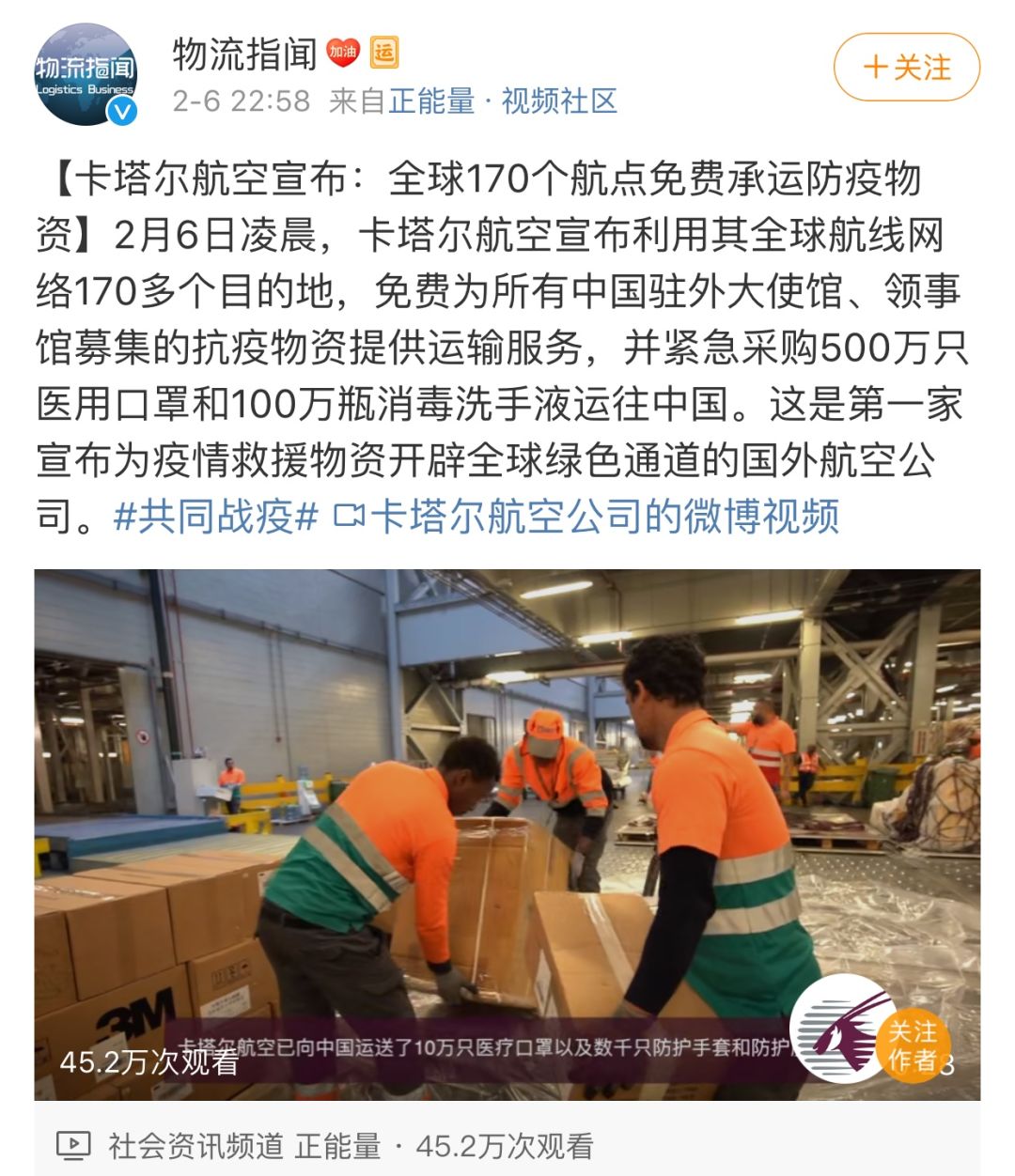 2月5日凌晨,卡塔尔航空宣布利用其全球航线网络,170多个目的地,免费为所有中国驻华大使馆、领事馆募集抗疫物资提供运输服务,并紧急采购了500万只医用口罩和100万瓶消毒洗手液运往中国。这是第一家宣布为疫情救援物资,开辟全球绿色通道的国外航空公司。1月26日,装有100万只日本民间捐赠的口罩,搭乘四川航空3U8086航班从东京飞抵成都双流机场,抵达成都后又通过汽车紧急驰援武汉。