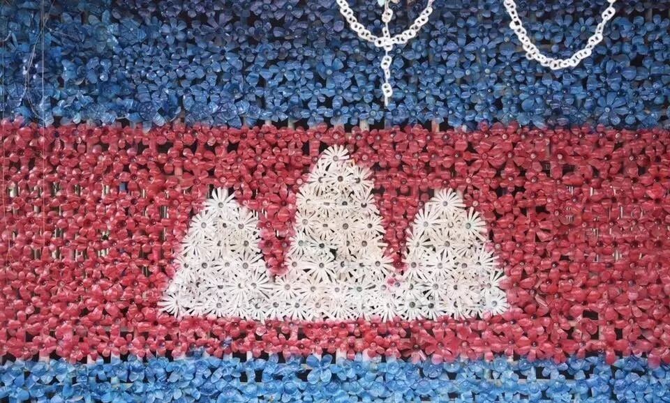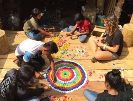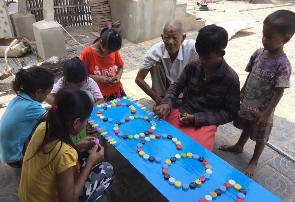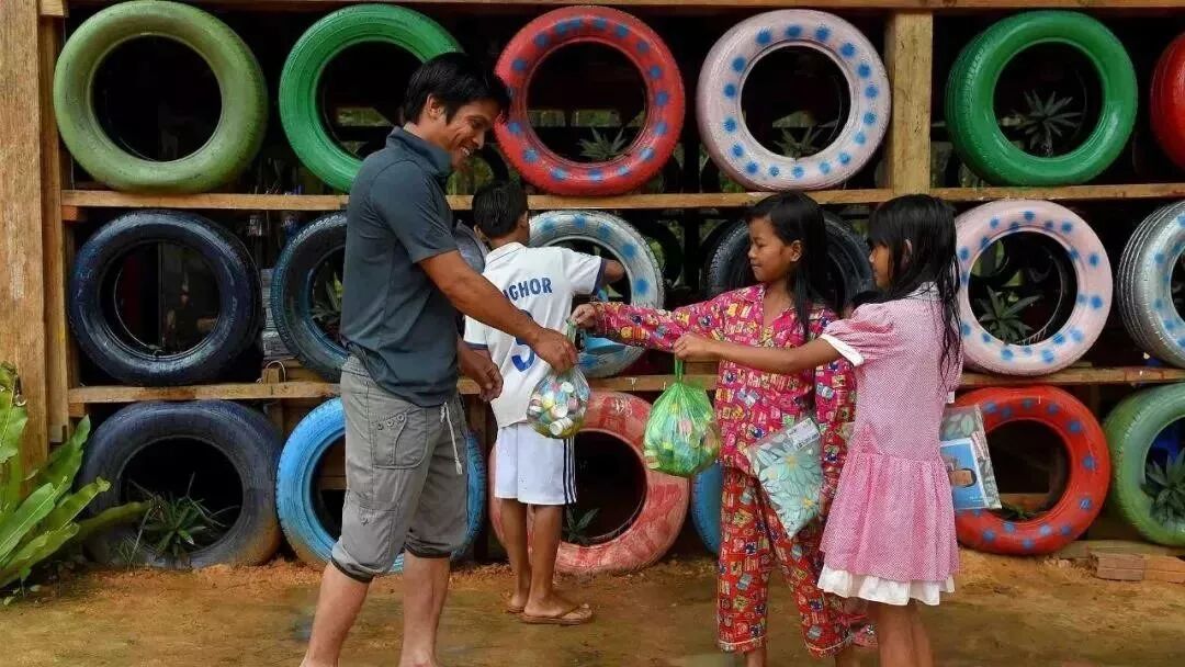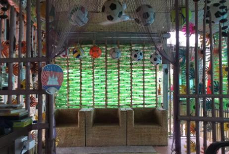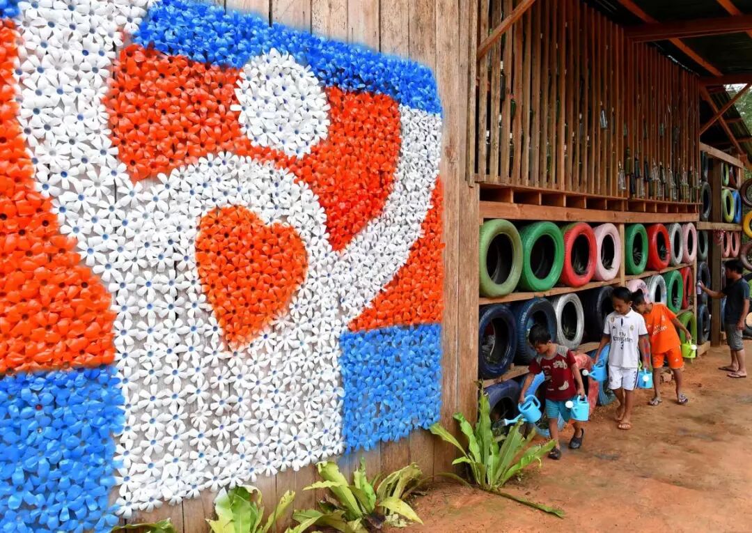 废旧轮胎,塑料瓶,旧运动鞋和瓶盖组成