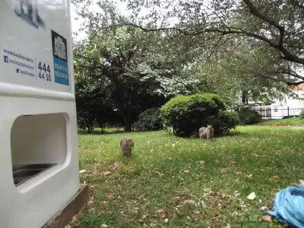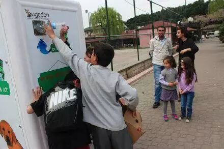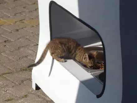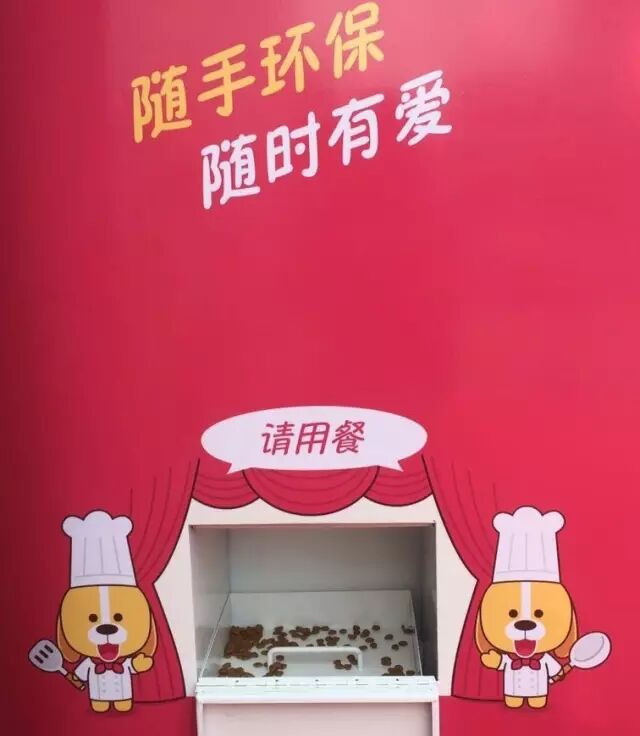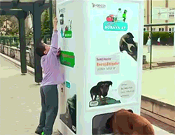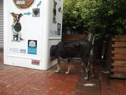 有种类似叮当猫的机器,只要把废弃的塑料瓶投进机器里,机器就会倒出一些猫粮、狗粮,附近的一些流浪狗、流浪猫们就会寻味而来。在解决了废物回收的同时,又为饥饿的小家伙们做了一些事。