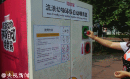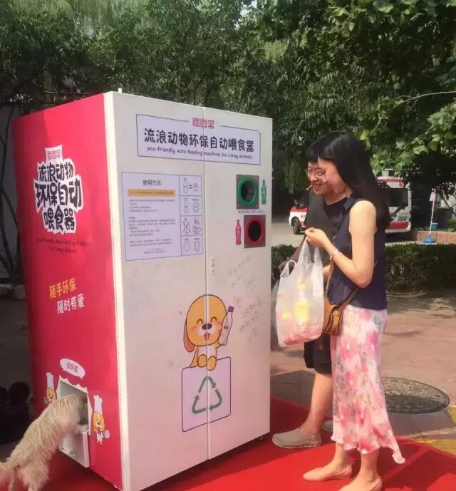 你只需将一个废弃塑料瓶投入“环保自动喂食器”,机器就会吐出20克口粮供那些无家可归的流浪猫狗们充饥。