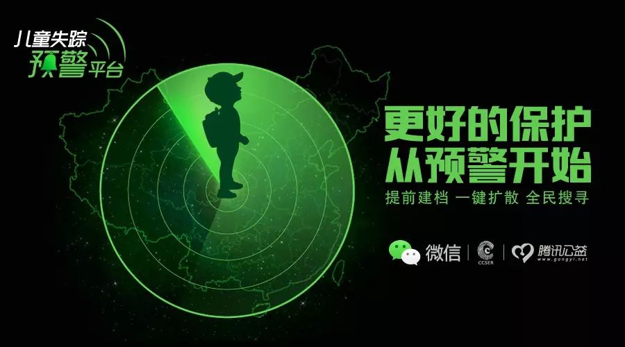 11月20日是“世界儿童日”,微信与中社儿童安全科技基金、腾讯公益联合发布 “中国儿童失踪预警平台(CCSER)”。利用移动互联网和GIS地理信息技术,依托拥有6亿月活跃用户的微信,构筑守护儿童免于失踪的“天网系统”。