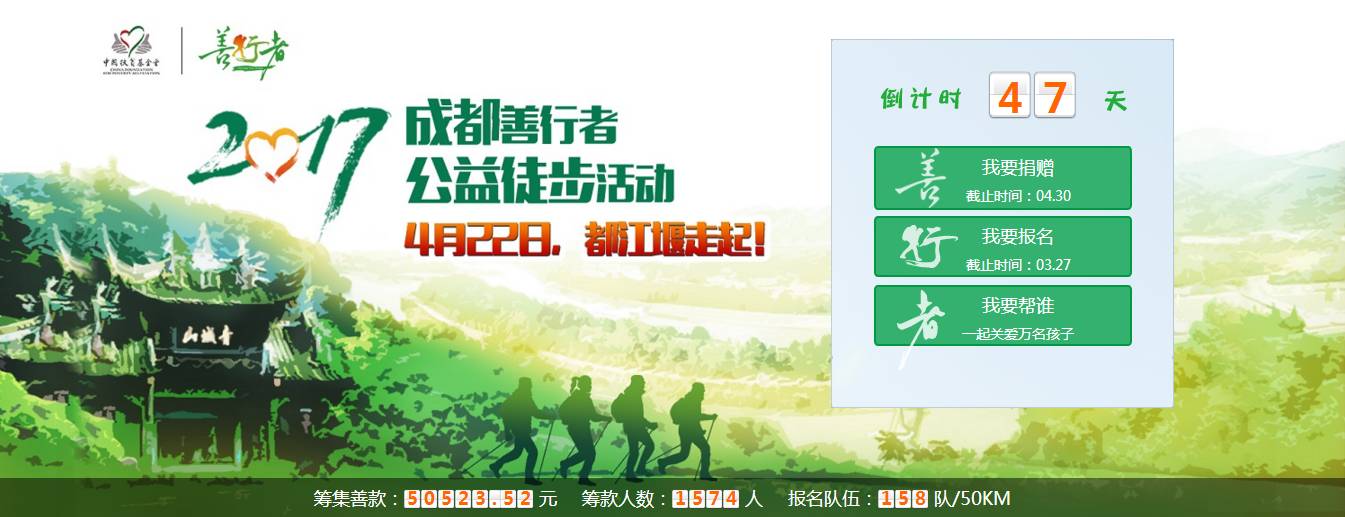 善行者——中国扶贫基金会于2014年发起的公益徒步活动,要求大家四人一队,共同进退,携手克服困难,在规定的时间内完成50公里或100公里徒步挑战,以“每一步都会带来改变”的信念,动员身边的人以实际行动支持公益,助力贫困地区儿童全面发展。